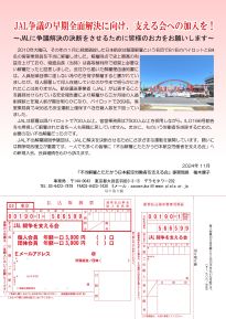 JAL闘争を支える会は引き続き闘争の解決をめざし、支援を継続いたします。闘いには闘争財政確立が重要です。一人でも多くの皆様に「不当解雇とたたかう日本航空労働者を支える会」の会員継続と新規のご入会をいただきますよう心から訴えます。